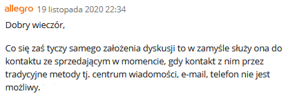 Nasz pracownik uprawniony do logowania na koncie Allegro odpowiada na sporne dyskusje raz na dobę - jeżeli są faktycznie sporem w transakcji.